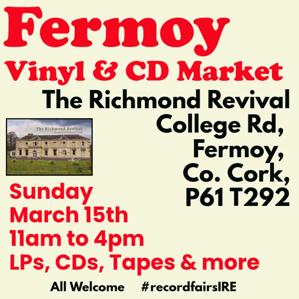 The Fermoy Record Fair takes place The Richmond Revival in Fermoy Co. Cork. The venue is located on College Road (cars/on foot) with a pedestrian entrance on Richmond Hill. There are no food offerings on site but the venue does promise coffee! There is ample free parking on site
