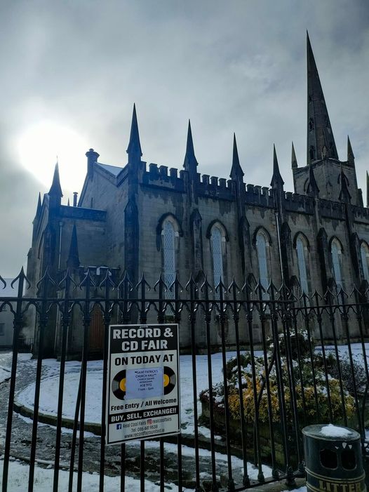 The Monaghan Record Fair takes place in the Hall of St. Patrick’s Church located on the diamond in the heart of the town centre and is generally a Saturday or holiday Monday. There is a large paid car park to the rear of the hall which has a nominal daily charge. There are no on site refreshments but all the cafés, pubs and shops of Monaghan are on the doorstep