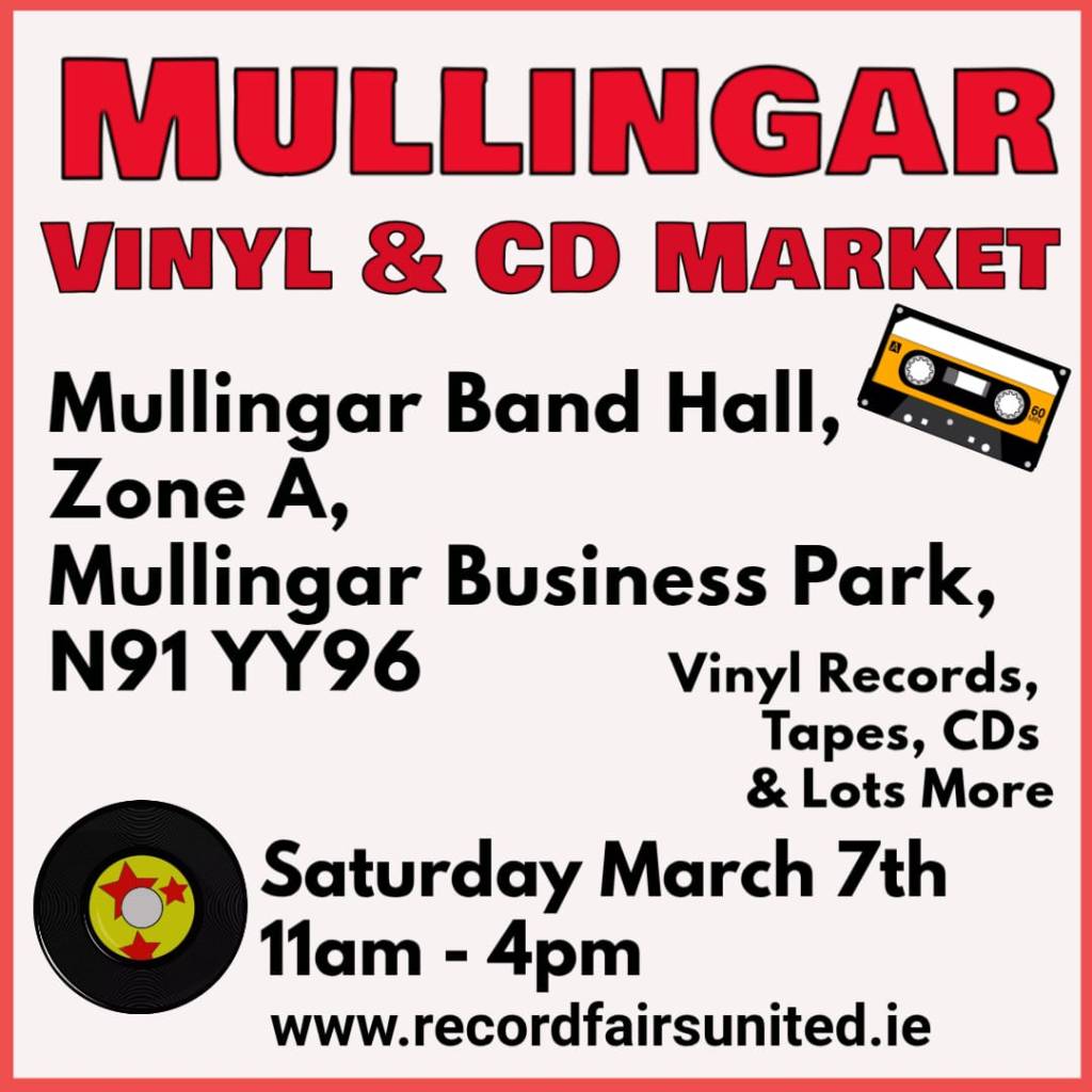 From Spring 2026, The Mullingar Record Fair will take place at The Mullingar Town Band Hall, Zone A, Mullingar Business Park. It will now take place on a Saturday. There is some free on site parking with paid parking close by as well. The venue is located a few minutes walk from the town centre and Mullingar Station.
